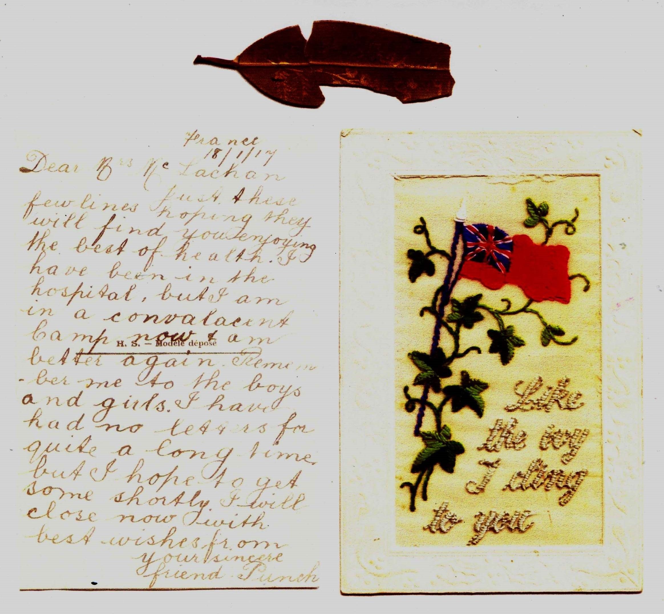 Punch as well as being wounded had severe problems with his feet which resulted in his spending time in hospital in December 1916. A letter to another friend, Mrs Emily McLachlan whose children grew up with Punch, shows he was still out of action in mid January: