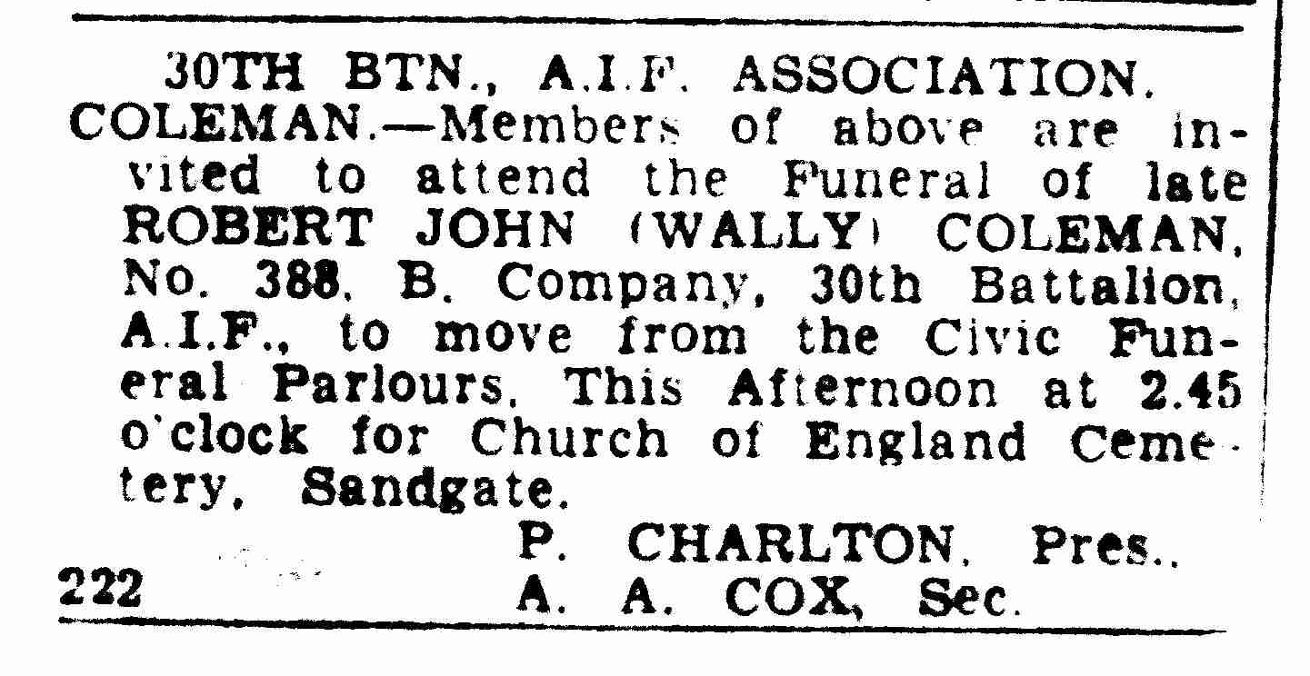 The use of the word ‘nigger’ underlines the ever present casual discrimination faced by men of Aboriginal heritage. However the mateship he enjoyed (like Bert Leane), was implicit on his death in 1944, in the notice placed by the 30th Battalion AIF Association in the Newcastle Herald.