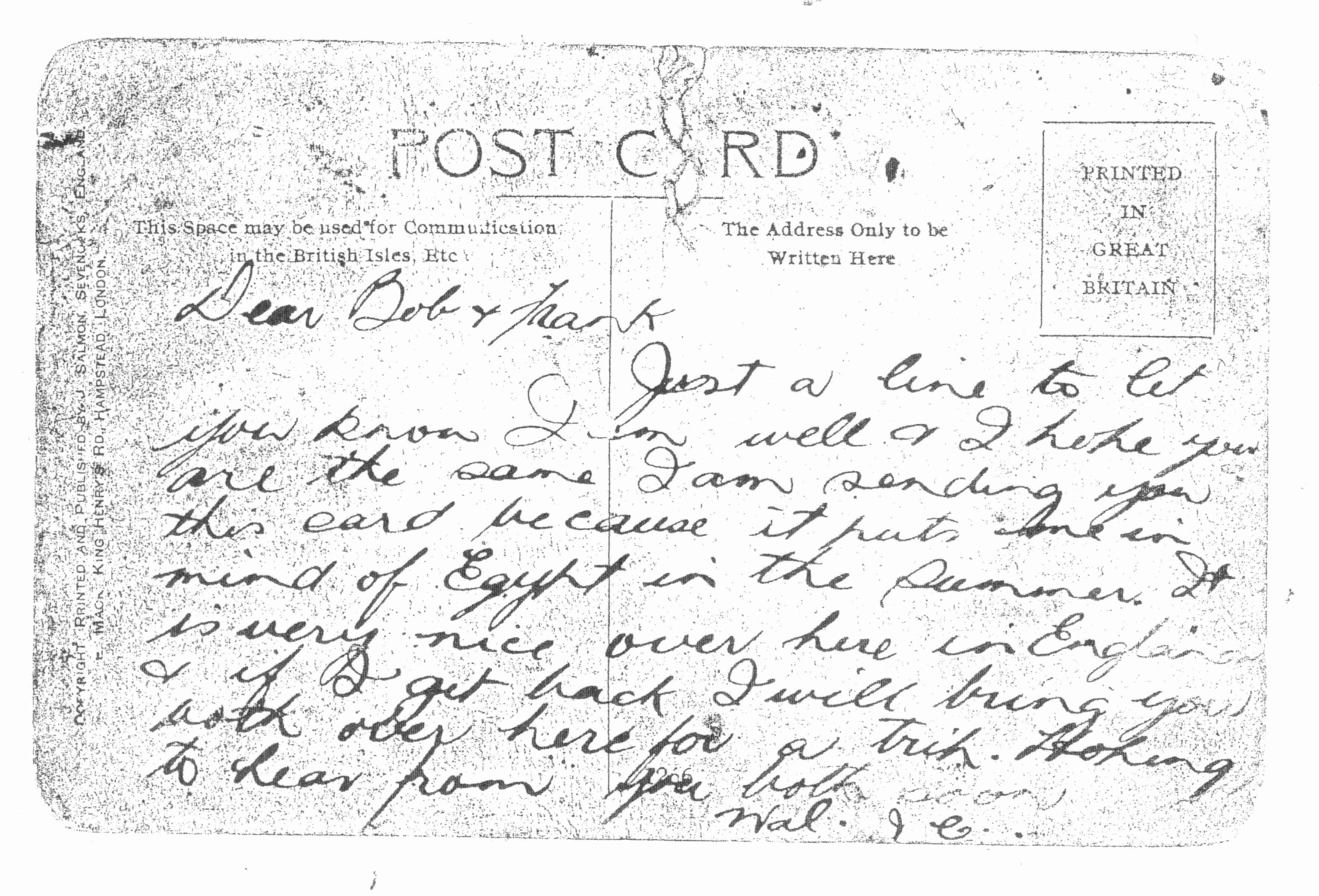 Family research by Leigh Budden has revealed another parallel with Bert Leane, known to his AIF friends as ‘Darkie’. He points out that Robert Budsworth was known not only as Walter John, Wal and Wally but also as Darkie Coleman. He also states that according to his mother’s cousin Ray Coleman, his grandfather was nicknamed ‘Nigger’ by many of his friends including some of his family. This was not meant as an insult but a (perverse) term of endearment. A post card sent to his brothers Frank and Bob from Wareham U.K. where Walter was stationed in March 1917 (while assigned to the later disbanded 61st Battalion) demonstrates the affection between the brothers.